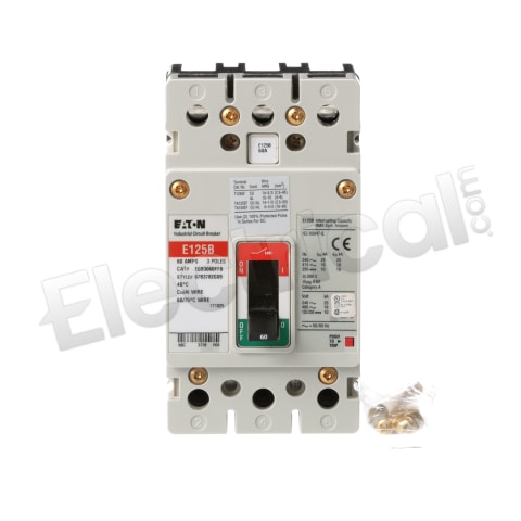 EGB3060FFB, Cutler Hammer, Series G, type EGB, 3P, 3PH, 60A, 480V, 18kA@480V, standard interrupting capacity, 40°C, Bolt-On, complete with non-interchangeable trip, LI - Long-Time and Instantaneous trip functions and load side lug terminals, Thermal Magnetic molded case circuit breakers