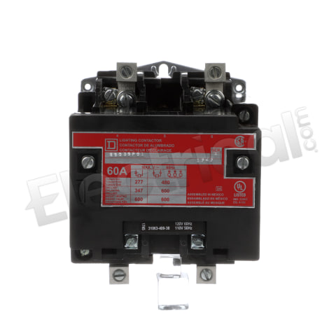 8903SPO1V02, Square D, Class 8903, multipole lighting contactor, type S, 2P, 1PH, 60A, with 110-120V coil, electrically held, open type enclosure